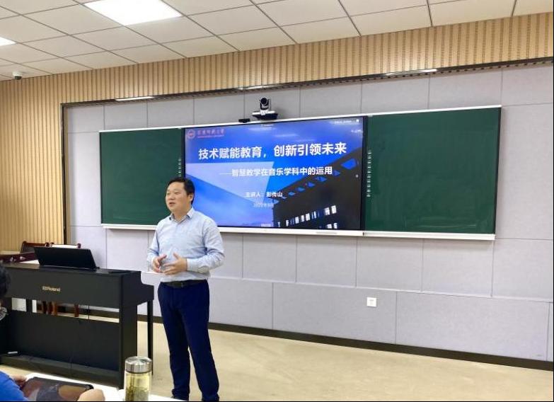 在智慧教室举办“智慧教学在音乐学科中的运用”的教学专题讲座,由4hu