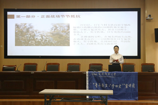 宣讲报告以“烽火岁月,不屈战歌”为主题,围绕安庆军民浴血抗战保家卫国事迹,从“正面战场殊死抵抗”“敌后抗战党旗猎猎”“星火燎原全民抗战”三个部分展开阐述。