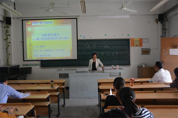 教工支部开展了主题报告专题学习与专题讨论活动。首先党总支副书记陈银凤结合学院党建工作和学院发展实际给全体教工党员作了题为“立德·修身·树人——教工党员的职业要求和育人意识”的专题报告,她首先对“立德树人”进行了解读,指出教师职业神圣性与自我修养的重要性,所谓“正人者先正己”;其次她指出教工党员应有明确的角色意识,也就是高校教师必须是社会主义教育的忠实执行者,守一方讲台,育需要之人;再次她从教师的职业情感和职业形象出发,具体讨论了教师应具备的素质要求,爱岗敬业,身正为范。