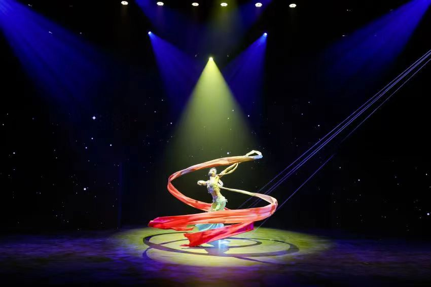 教师童昕用24米长绸的萦绕翻卷,成功地塑造了“霓裳曳广带,漂浮升天行”的敦煌飞天形象。