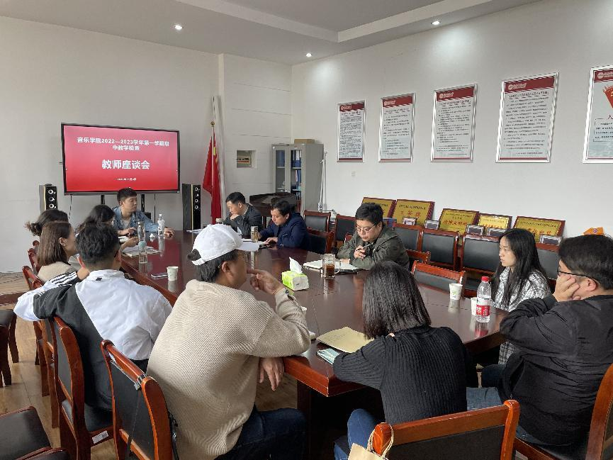 2022年11月3日,音乐学院在艺术楼一楼会议室召开2022-2023学年第一学期期中教学检查教师座谈会。会议由音乐学院副院长彭传山主持,副院长徐冉、党委副书记肖之进、授课教师代表刘梦、陈玲、武警、张召兴、张剑雨、孙艺铭、刘一朋、刘家禾、方尧杨、王光丽参加了会议。