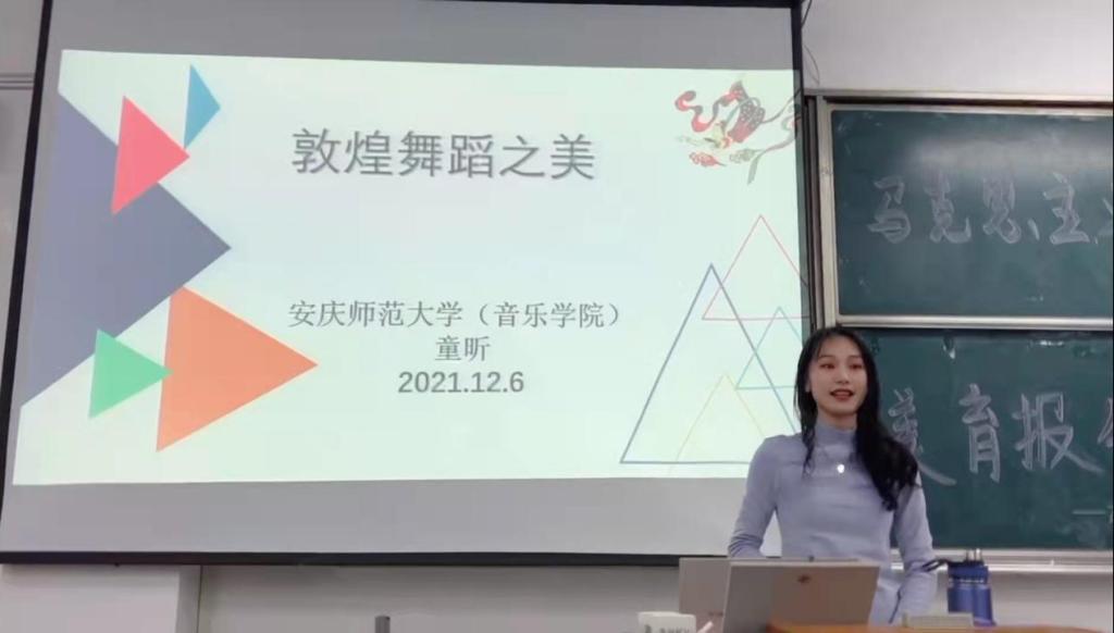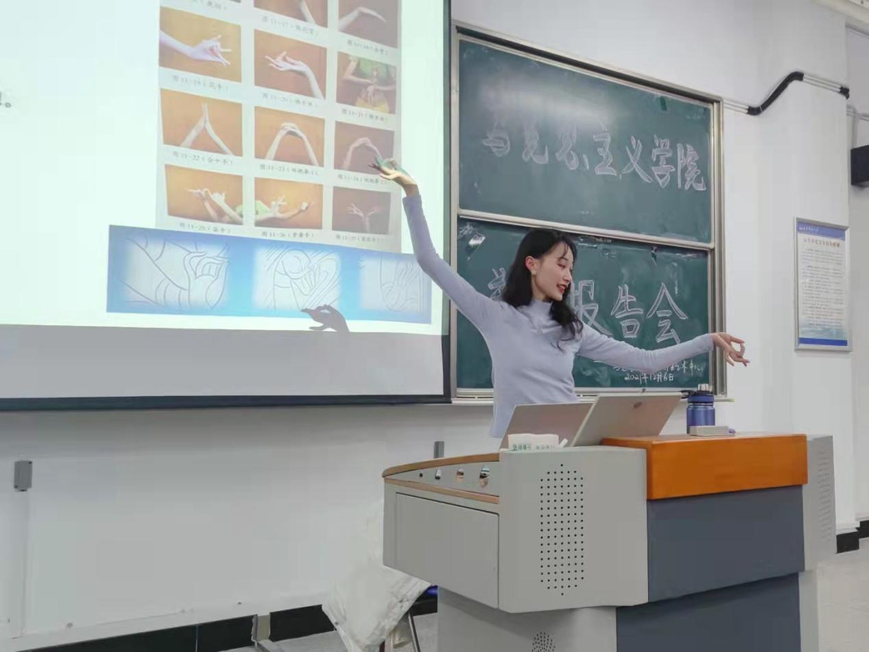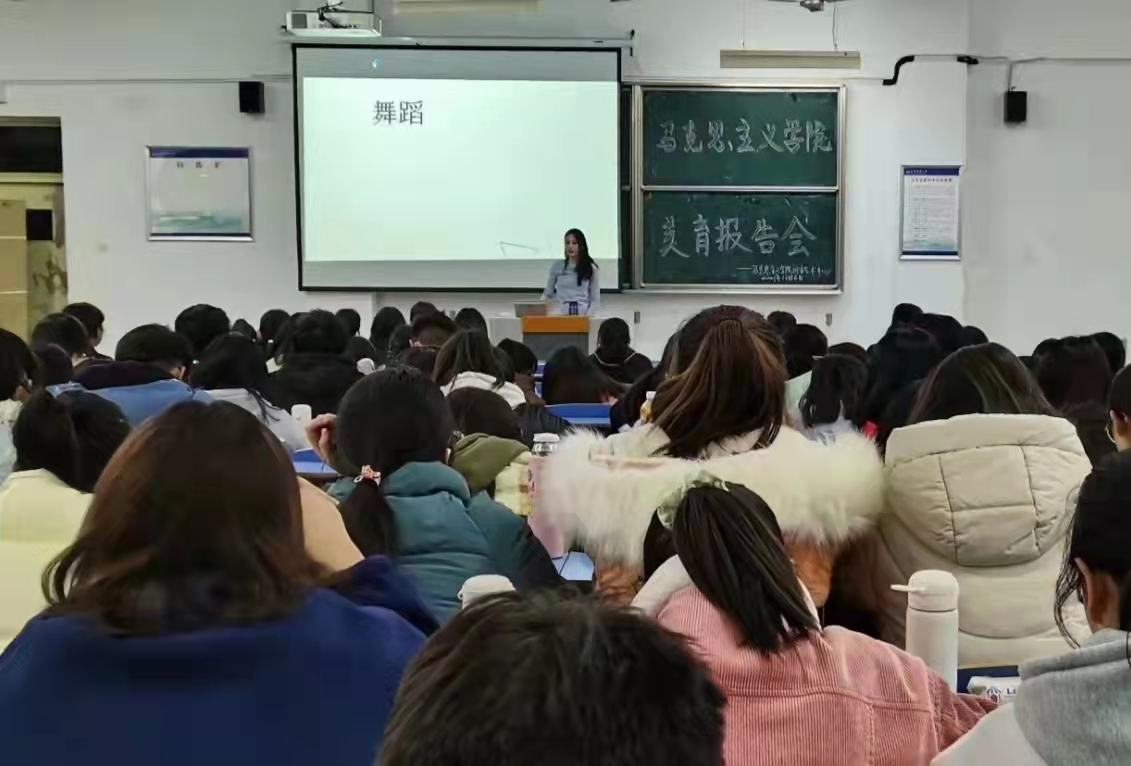 教师童昕在文津楼作“敦煌舞蹈之美”专题美育报告。马克思主义学院辅导员马翠临及160余名学生现场听讲。