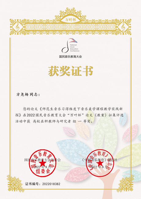 师生喜获佳绩。方尧杨老师的论文《师范生音乐习得维度下音乐美学课程教学实践新探》及《新时代美育视野下地方音乐的学校传承构想——以凤阳地区“凤阳三花”为例》分别获得了高校在职教师与研究者组一等奖和三等奖。2019级本科生严夏同学的论文《新时代美育视野下音乐师范生学习观念之变迁》获得了高校在读学生组优秀奖。