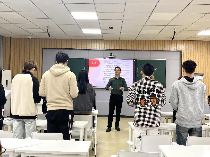 在艺术楼C楼203音体美智慧教室举行了主题党日系列活动——党员教学示范课活动。此次活动邀请了教工党员、校第四届智慧教学大赛一等奖获得者张昱靖老师进行《合唱与指挥》课程的智慧教学示范。出席本次活动的有院党委书记张铭、副院长徐冉、党委副书记肖之进以及全体教师,活动由副院长彭传山主持。