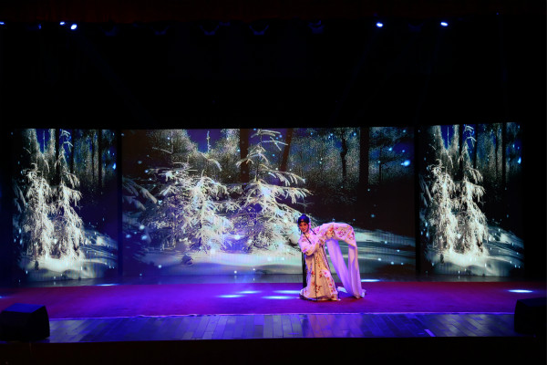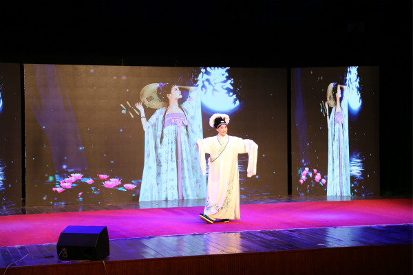 走如行云,袖若流水。黄梅戏表演专业师生专场演出在汪莉老师演唱的黄梅 歌《梨花颂》中拉开帷幕,清新甜美的歌声伴随水袖舞、团扇舞将黄梅戏的唱腔、身段等元素进行了精彩呈现。本次演出以师生同台的方式进行,是音乐黄梅剧艺术学院艺术实践周的第二个专场演出,包含了歌曲、舞蹈、折子戏等内容丰富的节目。