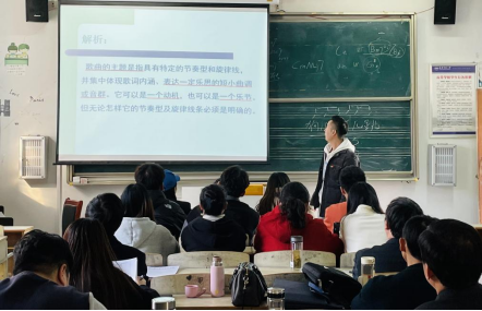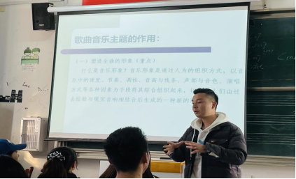 教师陈星源在艺术楼B105教室进行《歌曲写作与改编》课程的教学观摩课。学院党委书记李新建、副书记肖之进、副院长徐冉、各教研室主任、课题组成员及青年教师前来观摩。