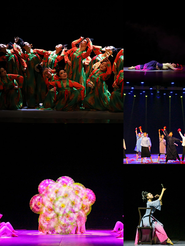舞者手持油纸伞,在台上旋转、变换队形,《茉莉花开》讲述着少女的心事;配合着傣族小调,头戴红色斗笠的两位舞者“合二为一”,展现《幻》的神秘唯美;抖脖舞臂,提裙旋转,《画廊》中的3位新疆姑娘从画框中“苏醒”,翩然起舞;衣着朴素,积极奋进,《进城》表现了农民工对美好生活的向往;或勾腿或伏地,《爱莲说》表演者不断变化动作,流畅婀娜的舞姿描绘莲花的各式姿态。