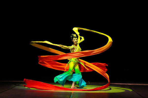 舞蹈教师童昕在舞台上挪动碎步、手舞彩带,舞蹈《飞天》将学生带入敦煌世界。长长的渐变色彩带,在童昕的手中灵动地飘舞,仿似被赋予了灵魂。细腻的演绎让观众仿佛在烟雾缭绕中,看到敦煌壁画中的美女走出壁画。舞蹈《希格希日》的热情豪迈燃爆全场,舞蹈教师武警、童昕与学生同台舞动,刻画出蒙古舞的不同风情,全场爆发出一阵阵欢呼。