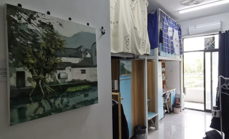 或用水墨山水画装饰,营造优雅精致的寝室氛围;或搭起各式床帘,展现宿舍特色;或张贴写有励志字样的书画,激励寝室成员努力学习。各寝室成员尽力发挥自身优势,打造宿舍特色。