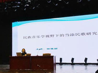 田雅丽教授首先简要介绍了民族音乐学的概念、研究对象和研究理念,随后评述了当涂民歌的历史源流、总体特征和研究现状,最后向大家分享自己对当涂民歌进行田野调查、搜集整理、创作改编、演出实践的经验。田教授的报告既科学严谨,又活泼生动,她与师生分享了大量采风与演出的视频,更亲自范唱了两首当涂民歌,从而拉近了广大师生与民间音乐的距离,使4hu