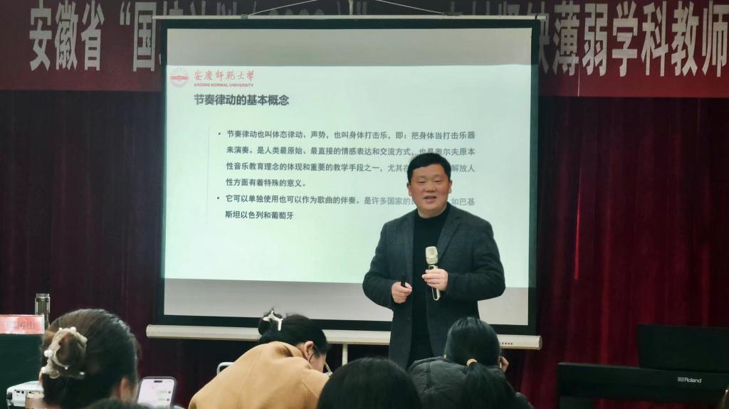 2023年2月10日,2022年安徽省“国培计划”农村紧缺薄弱学科教师短期集中培训项目——艺术(音乐)系列讲座第八场《节奏律动训练及在中小学中的运用》分别在小学音乐班和中学音乐班举行,由4hu