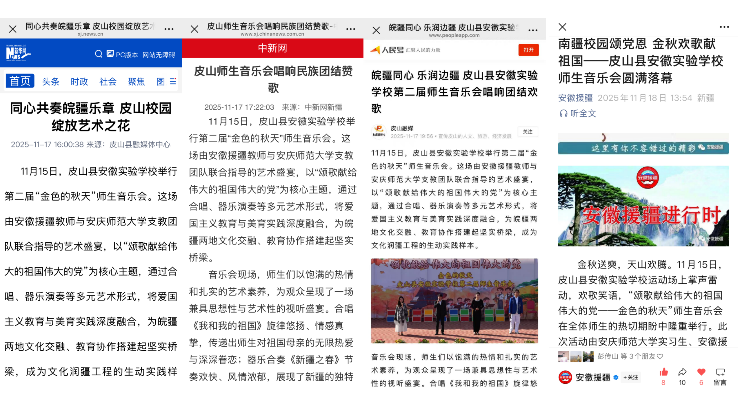 彭传山、魏星月、马凌云、喻心悦、陈帅等6名援疆支教师生组织并参演的“颂歌献给伟大的祖国伟大的党”——皮山县安徽实验学校“金色的秋天”第二届师生音乐会圆满落幕,反响热烈。新华网、中新网、人民网、安徽援疆网等媒体均对活动进行了报道,一致认为本场演出融合合唱、器乐演奏等多种艺术形式,将爱国主义教育与美育实践有机融合,为皖疆两地文化交融与教育协作搭建了坚实桥梁,是文化润疆工程的生动实践。