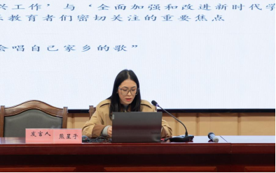熊星子老师以《安庆地区非遗音乐融入乡村美育之构想》为题,从研究背景、安庆非遗音乐融入乡村美育的可行性分析与策略构想三方面进行了论述。