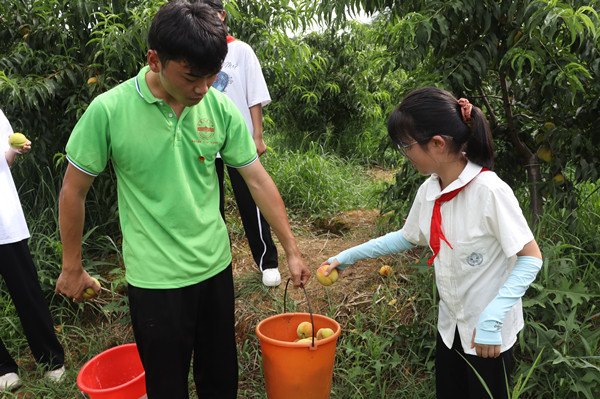 “音为爱”教育关爱暑期“三下乡”社会实践团的11名成员化身“小老师”,将劳动课堂搬到怀宁县美好田园生态农业有限公司的黄桃园,给腊树初中的30余名“留守”学生上了一堂特色劳动课。
