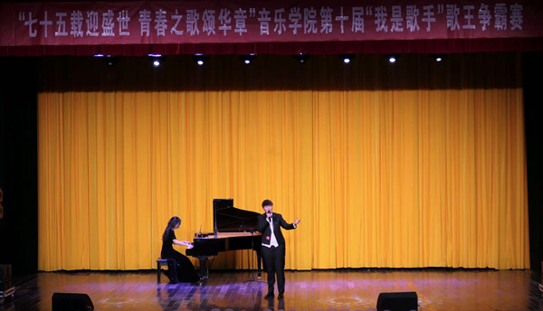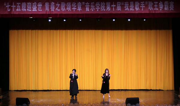 “七十五载迎盛世 青春之歌颂华章”第十届“我是歌手”歌王争霸赛决赛在校音乐厅举行。院党委副书记肖之进、副院长彭传山及300余名观众来到现场观摩。副院长高艳,教师刘蕊、王鹏、张源宁、王晨宇担任评委,18个兄弟院系学生会成员担任赛事观众评委。
