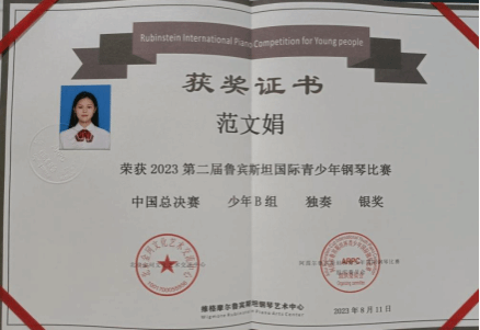 8月11日由德国音乐理事会主办的2023鲁宾斯坦国际青少年钢琴比赛在北京落下帷幕。4hu 2021级本科生范文娟所演奏的《皮黄》荣获少年B组独奏银奖。
