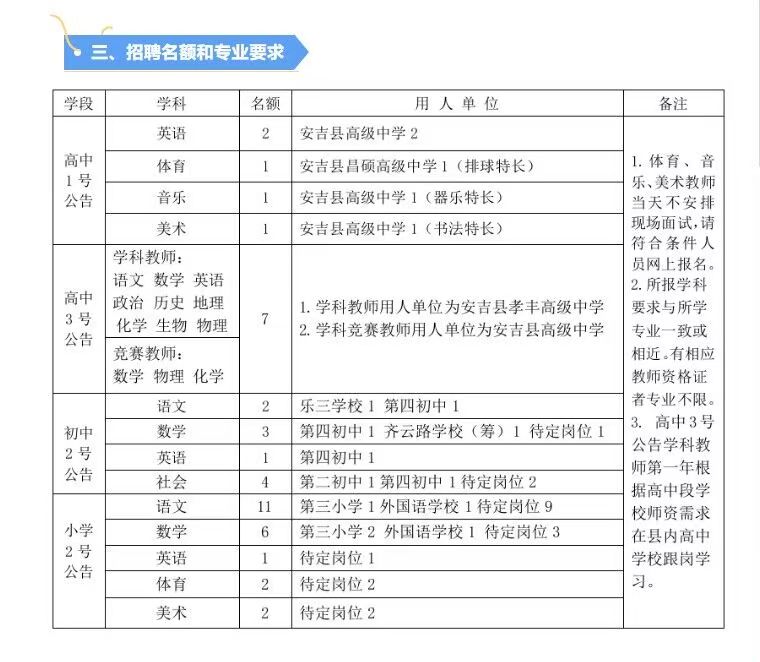 根据《浙江省安吉县招聘2024年教师公告(第1号)》《浙江省安吉县招聘2024年教师公告(第2号)》《浙江省安吉县招聘2024年教师公告(第3号)》内容,我县组团赴安徽师范大学、湖州师范学院现场择优招聘事业编制教师44名,具体招聘事项公告如下: