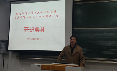 开班典礼在一段庄严的《国际歌》中拉开序幕。会上,培训班班主任宣读了学院党校培训工作通知,并介绍了开班计划、课程安排、培训班班规等。音乐学2019级(4)班谢宝山代表本期培训班学员作了表态发言,表示将以热情端正的态度、刻苦的学习精神投入到党课学习中去,以行动与成绩来诠释服务奉献与积极向上。。